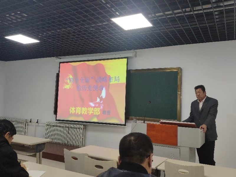 体育教学部直属党支部于2019年10月17日上午在文体馆多媒体教室开展了“不忘初心、牢记使命”主题教育活动,由支部书记韩贵讲党课:“四个全面”战略布局的历史使命,支部全体党员和校巡回组高乐、张伟同志参加了本次党课学习。