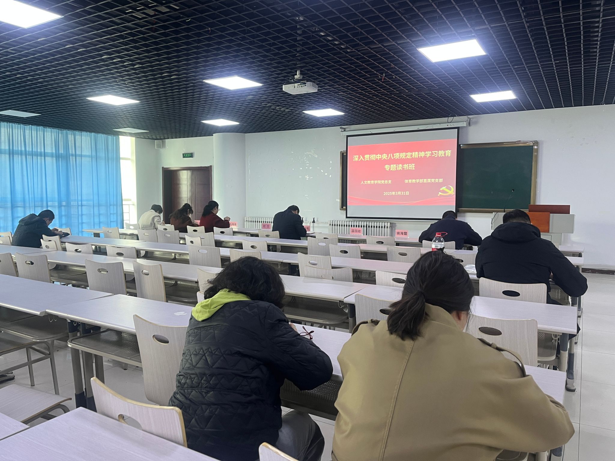 3月28日、31日,体育教学部直属党支部、人文教育学院党总支联合举办深入贯彻中央八项规定精神学习教育读书班,深学细悟习近平总书记关于加强党的作风建设的重要论述,深入学习领会中央八项规定及其实施细则精神,全面落实中央、自治区统一部署和学校党委工作要求,持续推动深入贯彻中央八项规定精神学习教育走深走实。