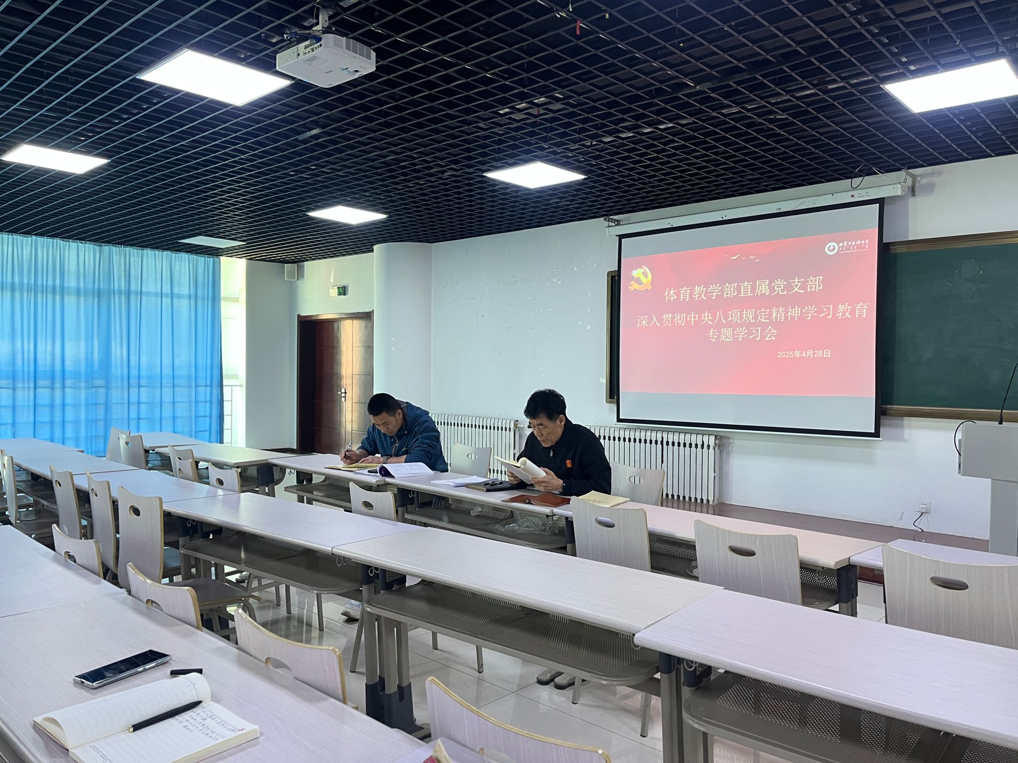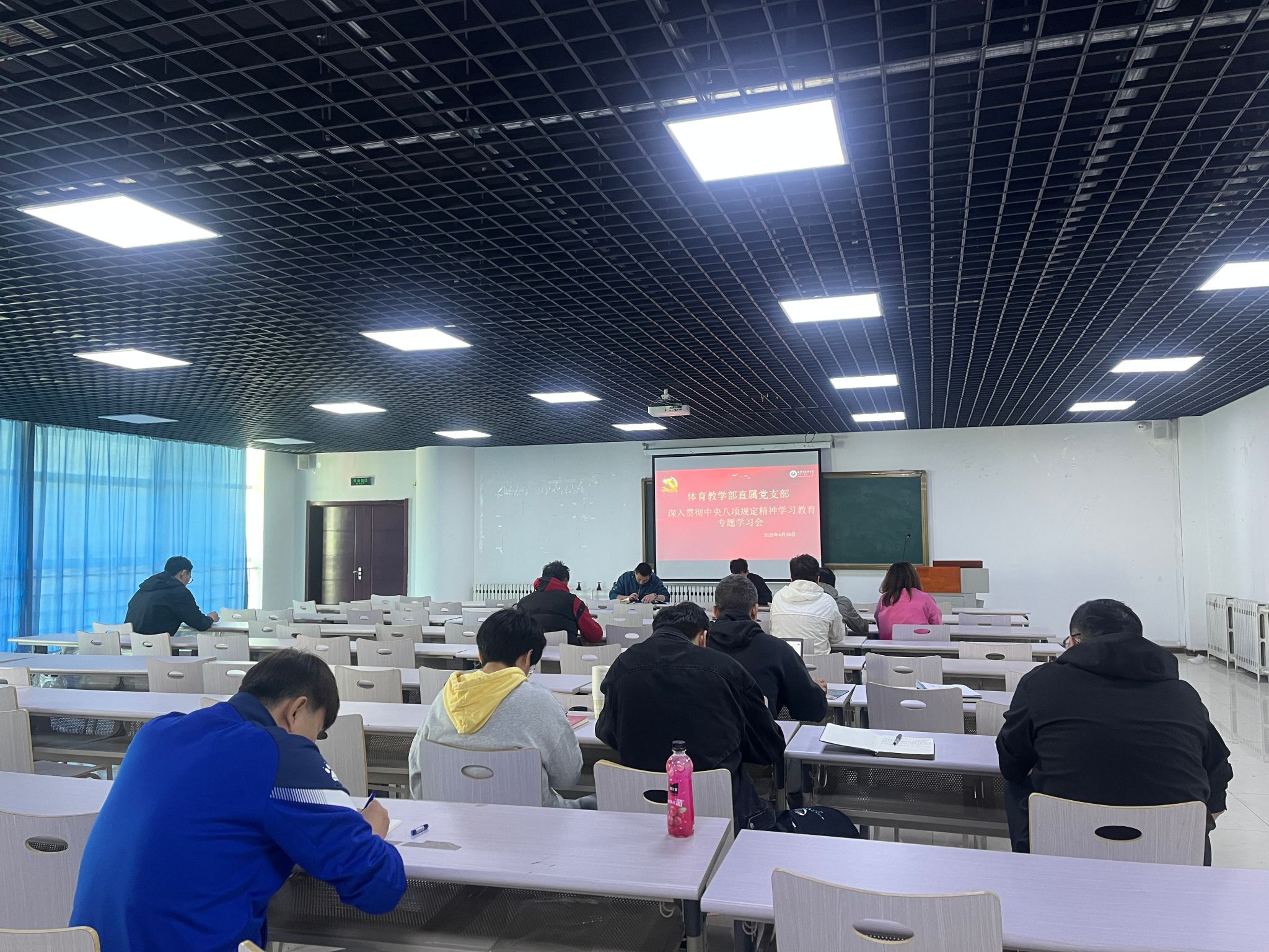 4月28日上午,体育教学部直属党支部在文体馆四楼多媒体教室召开深入贯彻中央八项规定精神学习教育专题学习会。会议由支部书记杜文主持。全体党员参会。