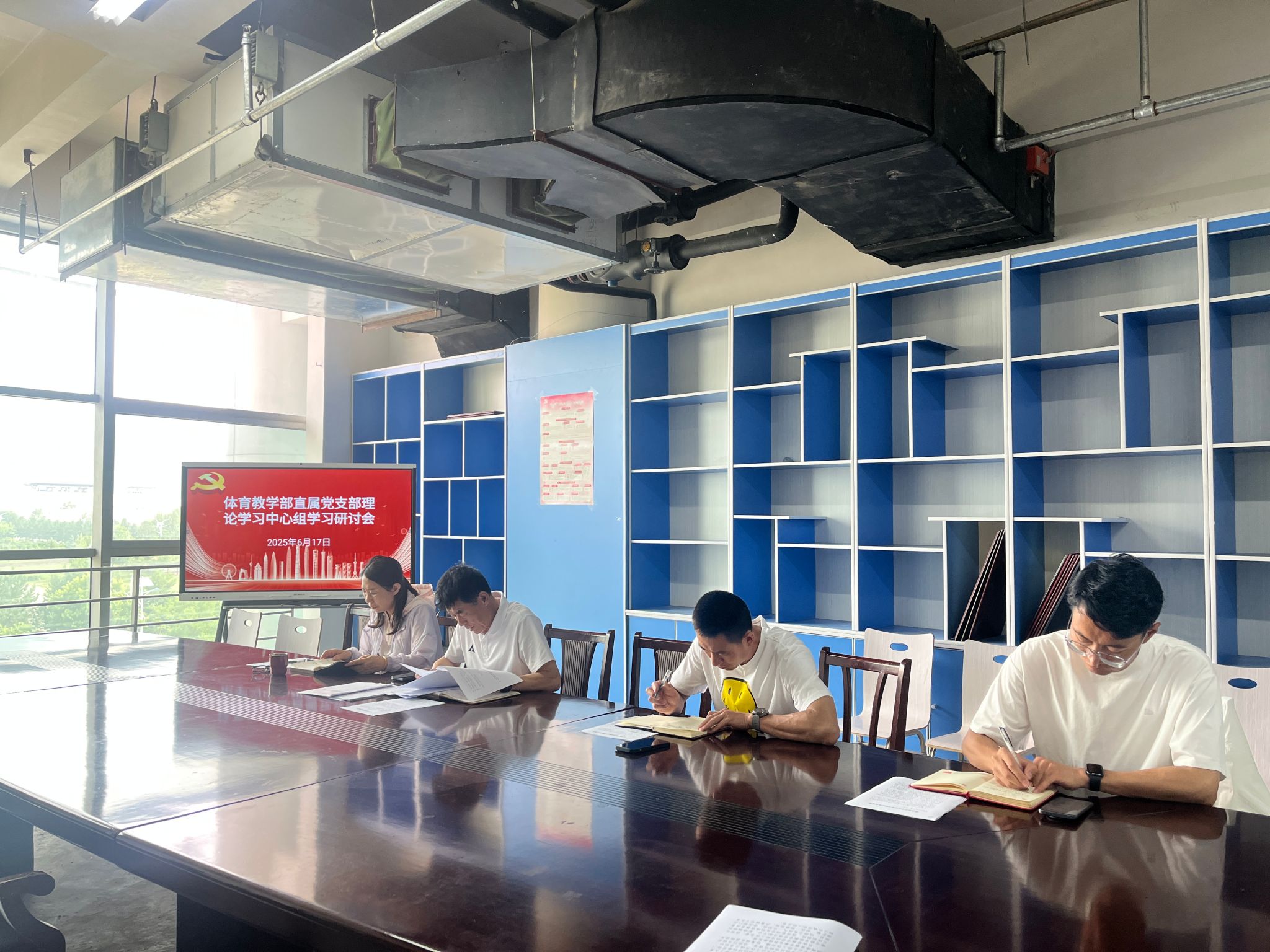 6月17日上午,体育教学部直属党支部召开了理论学习中心组学习研讨会。会议由支部书记杜文主持。领导班子、支部委员参加了会议。